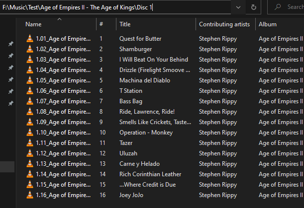Let's say I want to navigate the folder structure and copy all the Metal Gear albums. As it is I have them right there, in alphabetical order, instead of how many artists folders scattered all over the place.
