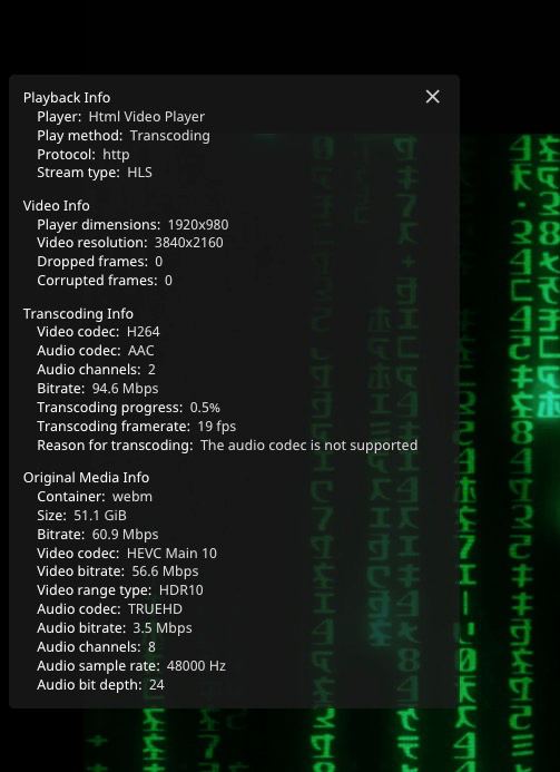 I'm finding that Jellyfin is transcoding video content while listing the reason for transcoding as Audio Codec Not Supported.