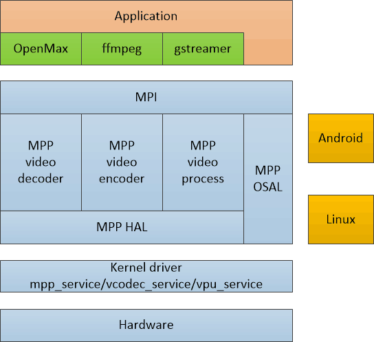 MPP层通过MPI对接各种中间件软件,如OpenMax和gstreamer,或者直接对接客户的上层应用。