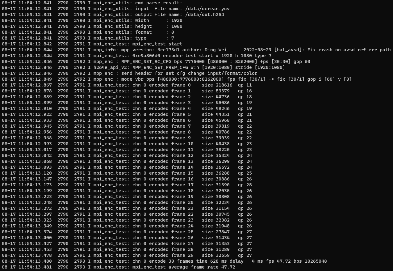 为mpi_enc_test本身的打印,表示编码器编码30帧所用的时间为628 ms,编码第一帧数据的延迟时间为4ms,帧率为47.72,码率为10.2Mbps。