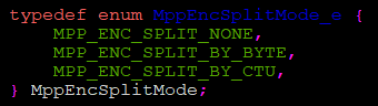 split_mode RK_U32 编码器分片模式。0:不分片; 1:按字节分片; 2:按CTU分片。