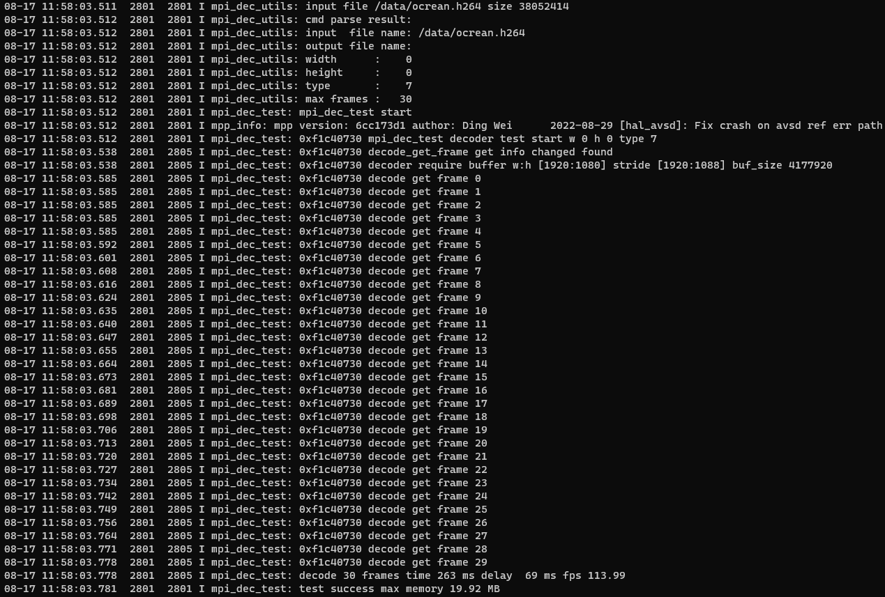 为mpi_dec_test本身的打印表示解码器解码30帧所用的时间为263ms解码第一包数据的延迟时间为69ms帧率为113.99。