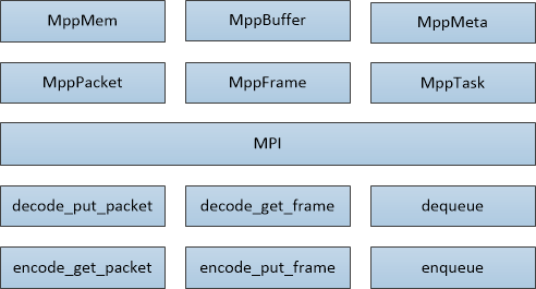 由于视频编解码与视频处理过程需要处理大量的数据交互,包括码流数据、图像数据以及内存数据,同时还要处理与上层应用以及内核驱动的交叉关系,所以MPP设计了MPI接口,用于与上层交互。