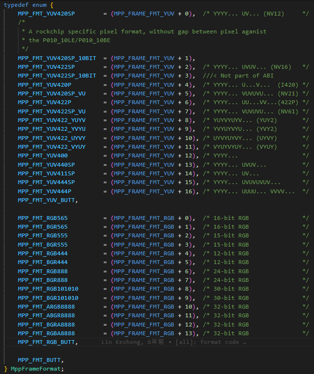 图像的色彩空间格式分为YUV和RGB两类。MPP支持多种内存排布方式(f),id后的数字为不同内存排布方式对应的参数值,值得注意的是,YUV和RGB格式的参数值有显著区别。